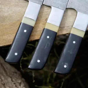 Upgrade your culinary experience with this Handmade Damascus Steel 3-Piece Chef Knife Set, crafted for precision and durability. Featuring razor-sharp edges, ergonomic black and white handles, and a stunning file-worked spine, this premium set is perfect for professional chefs, home cooks, and gifting occasions such as birthdays, anniversaries, and housewarmings.