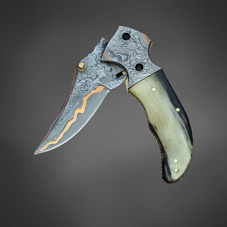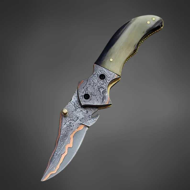 The combination of copper and Damascus steel creates a visually stunning blade with exceptional strength. The natural ram horn handle provides a comfortable grip, making this knife suitable for both everyday tasks and special occasions. Each knife is handcrafted to ensure quality and individuality.